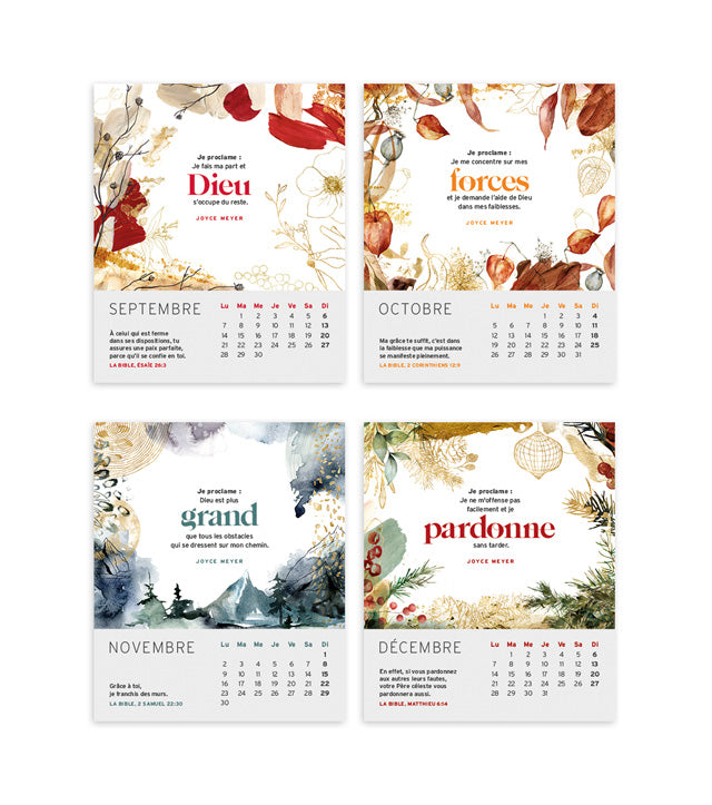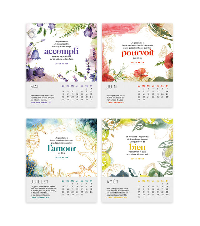 Ce magnifique calendrier vous accompagne mois après mois grâce aux déclarations puissantes de foi signées Joyce Meyer et de versets bibliques adaptés, pour renouveler votre manière de penser et de parler :